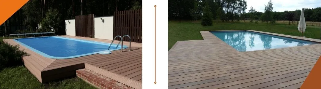 Керамическая плитка, искусственный или натуральный камень, ПВХ-пленка, террасная доска дома может использоваться при строительстве стационарных бассейнов (он может располагаться в крытом помещении или на открытой площадке). Перечисленные материалы станут прекрасными материалами для отделки бортов, сооружения лестницы, устройства прилегающей зоны отдыха.